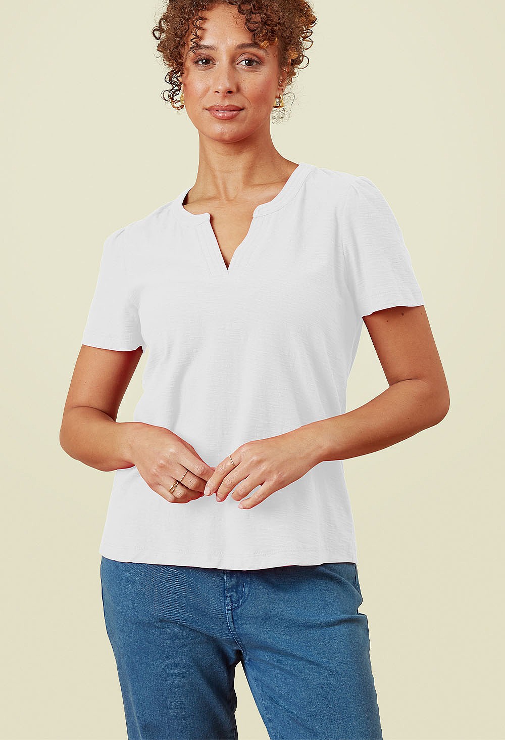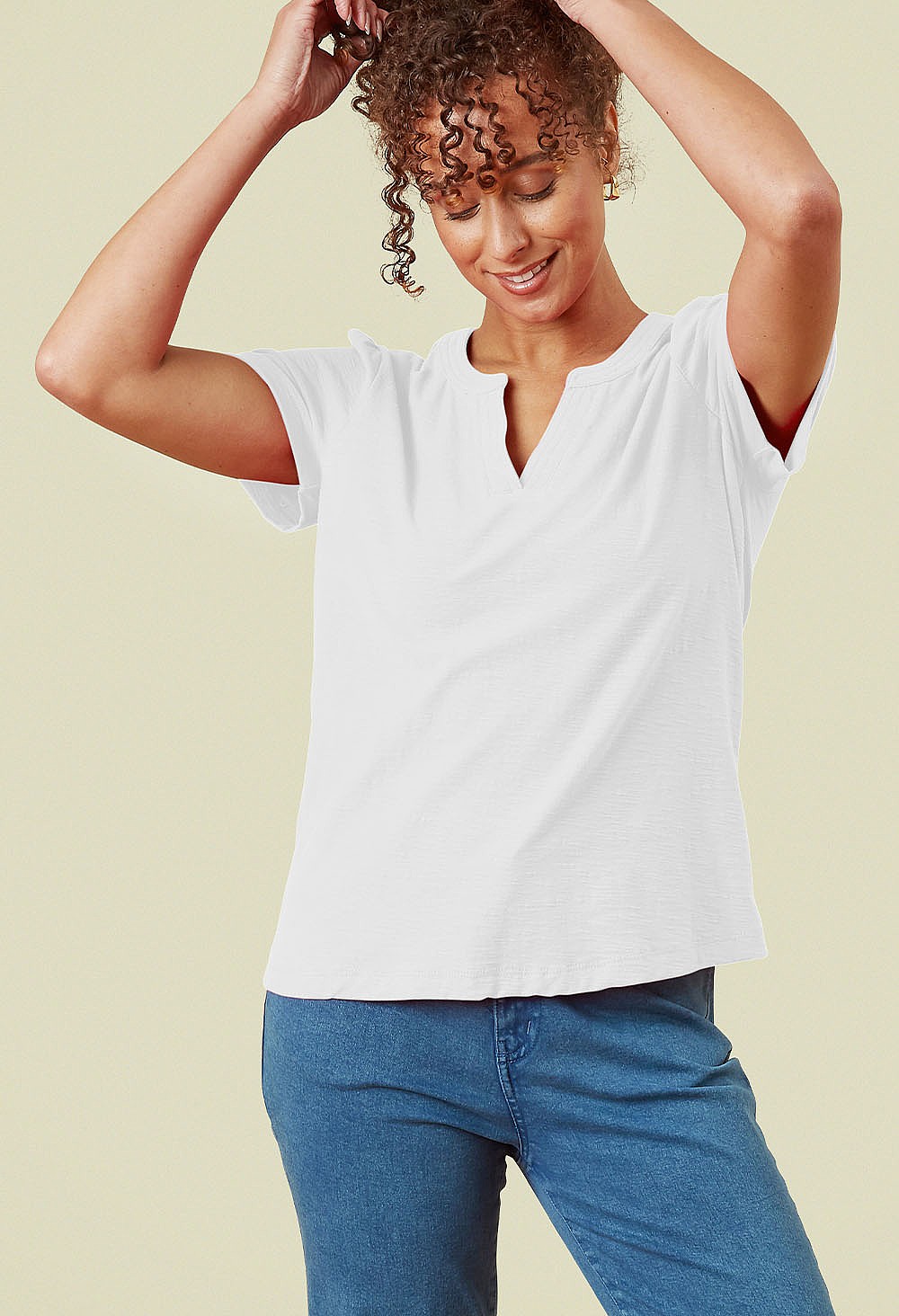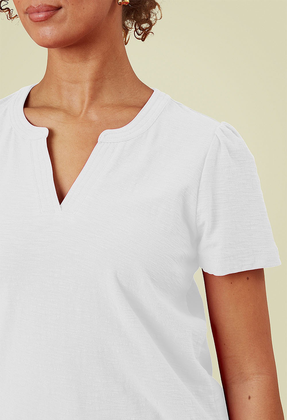 The perfect t-shirt to add to your spring/summer wardrobe.  Made from cool and natural cotton slub jersey, with its mandarin collar and small v neck it is the ideal casual holiday top.