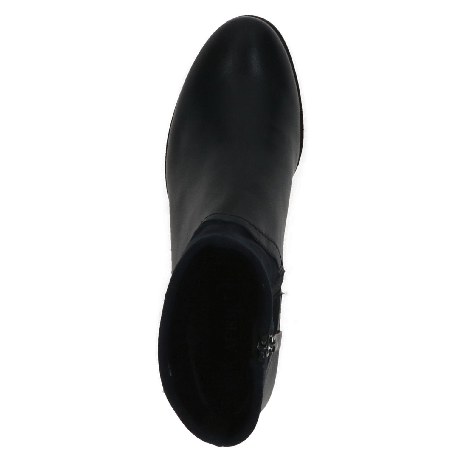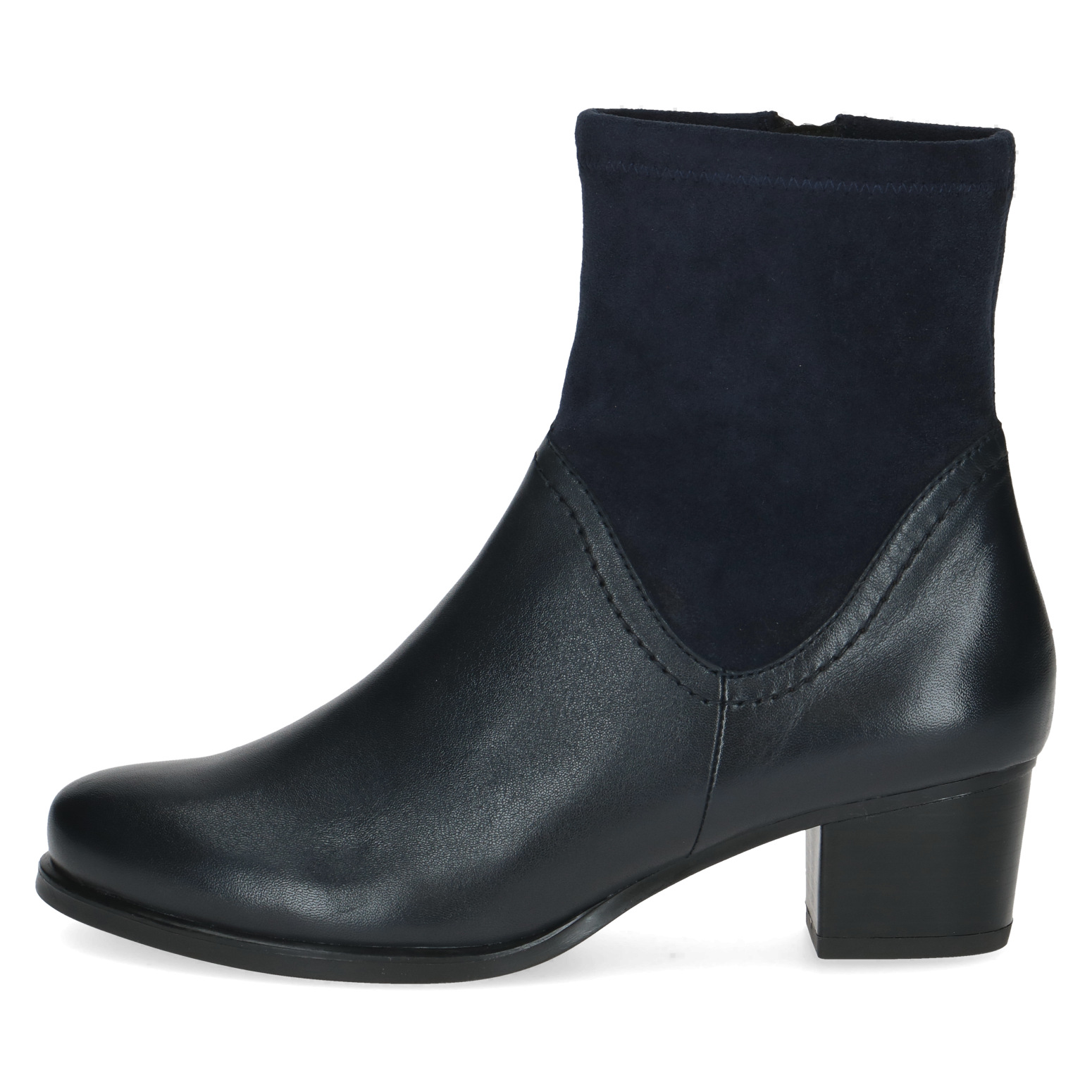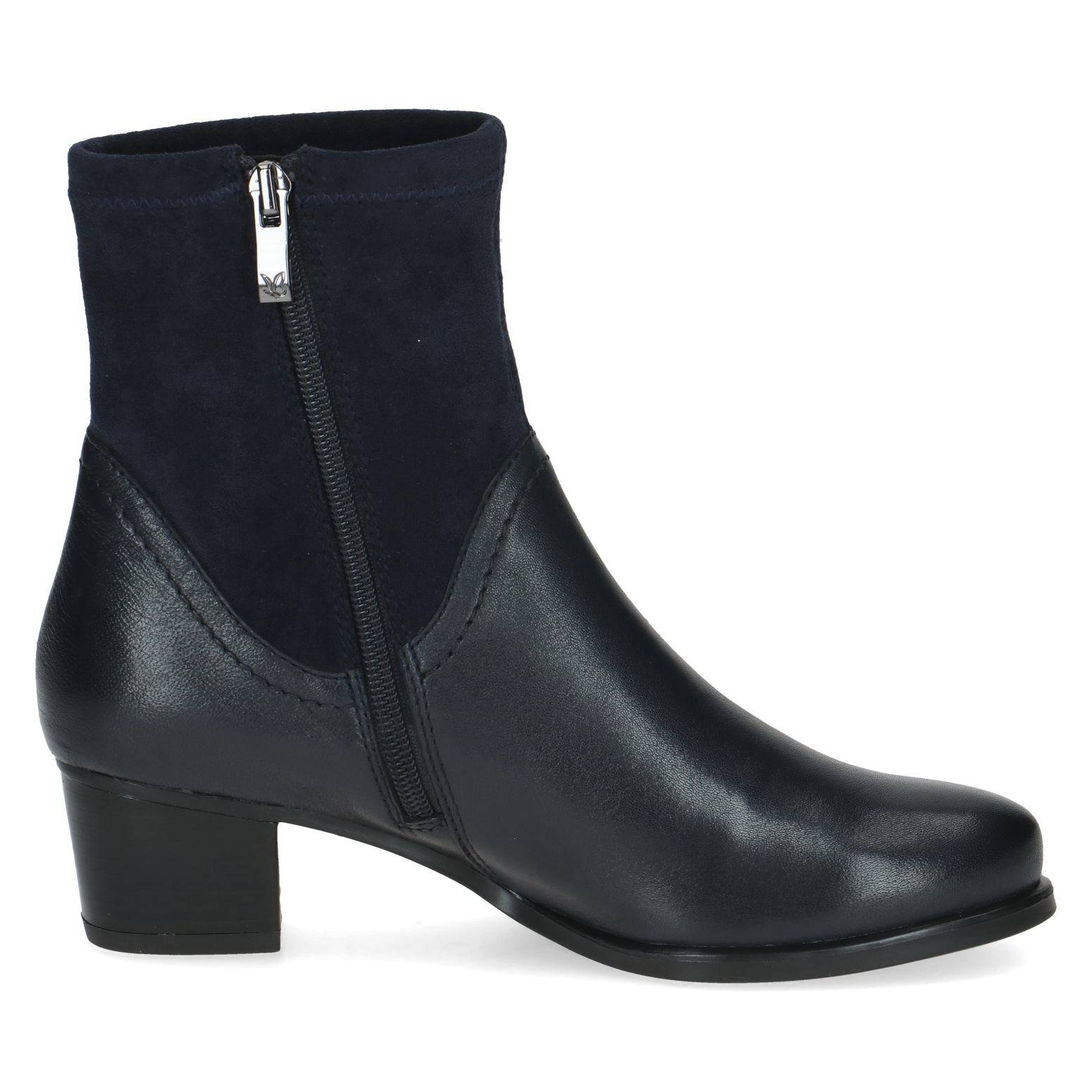 A stylish boot which has a navy leather foot with textile suede effect leg with a heel and inside zip.