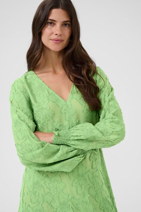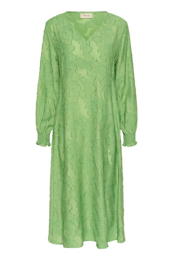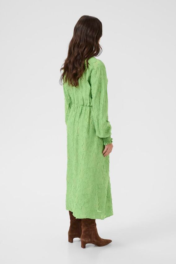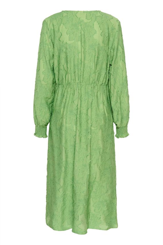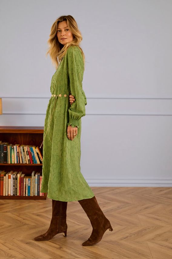A flattering relaxed fit midi dress featuring a V-neckline, and long voluminous sleeves with smocked cuffs. With an elasticated waist at the back, and textured detailing, this dress is both comfortable and elegant and would work well from day to night.