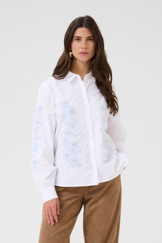 Another pretty shirt by Cream with beautiful soft blue embroidered flowered panels down each side and on each sleeve. A classic white shirt with collar and cuffs, ideal to wear as smart casual or even office wear!