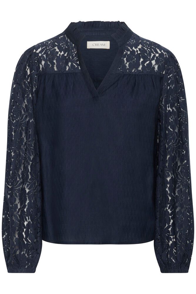 Fluted collar with v neck and lace front shoulder and long sleeves, which have an elasticated cuff.