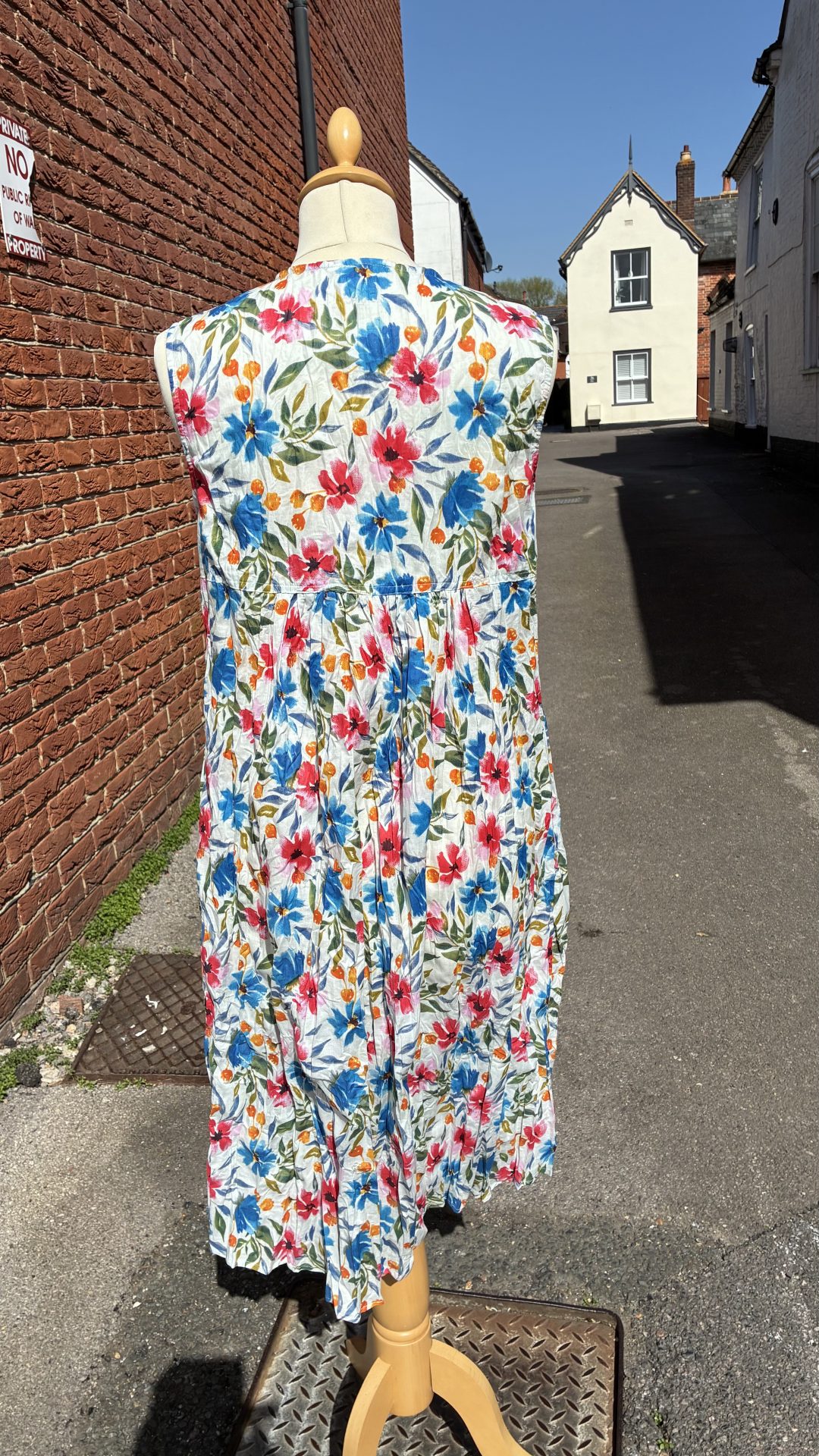 This very colourful floral dress comes in a mix of blue, green, pink orange and yellow. A sleeveless v neck dress, with front pleats and two side pockets.