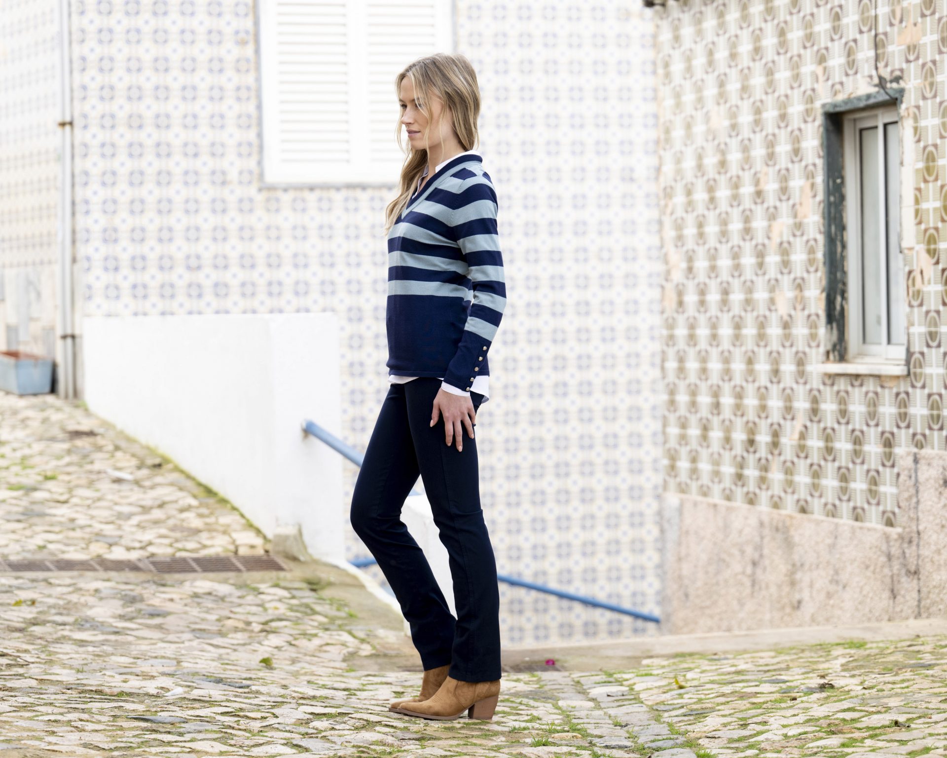 Super soft viscose mix, classic fit, two colour sweater with deep v neck and cuff placket with Marble branded buttons